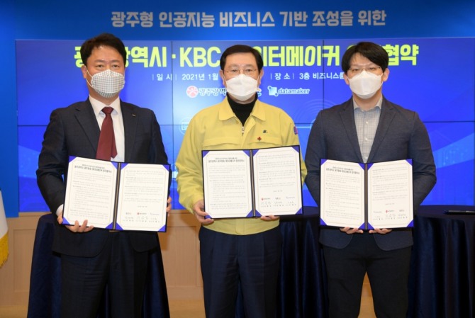 이용섭 광주광역시장이 19일 오후 시청 비즈니스룸에서 임채영 KBC 대표이사 사장, 이에녹 데이터메이커 대표이사와 광주형 인공지능 비즈니스 기반 조성을 위한 업무협약을 체결한 후 기념촬영을 하고 있다.(사진 좌로부터 임채영 KBC 대표이사 사장, 이용섭 광주광역시장, 이에녹 데이터메이커 대표이사)./광주광역시=제공
