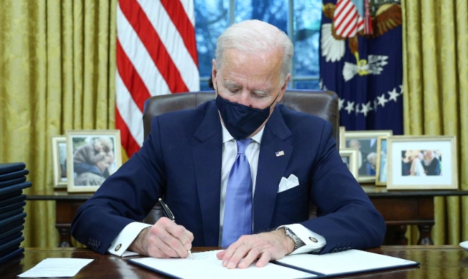 바이든 대통령은 첫 행정조치로 트럼프 행정부가 내린 환경 정책에서 벗어나 오바마 행정부 시절 형성된 국제 협약인 파리기후변화협약에 미국이 재가입 하는 명령에 서명했다.