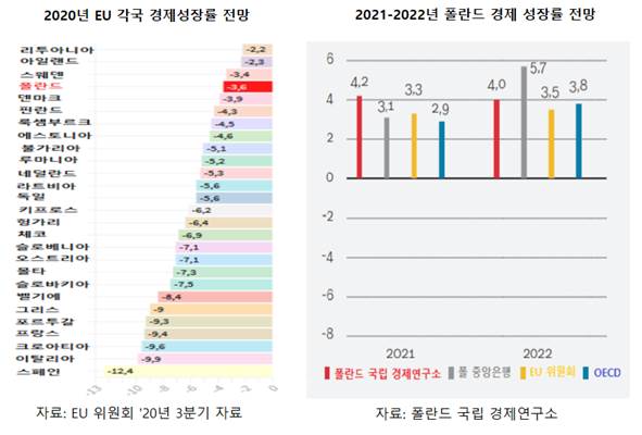 폴란드는 최근 몇 년간 4%대 이상의 높은 경제성장률을 보였으나, 2020년은 코로나19의 여파로 폴란드 경제가 큰 타격을 입어 마이너스 3% 이상대로 경제성장률이 하락하는 결과를 나타냈다. 그러나 폴란드의 경제 불황은 장기간 계속 될 것으로 보이지 않으며, 그 동안 폴란드의 거시경제가 안정적으로 성장하였기 때문에 올해부터는 비교적 완만하게 경제회복기에 들어갈 수 있을 것으로 평가되고 있다.