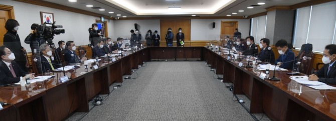 이날 회의는 더불어민주당에서 김진표 의원, 윤관석 정무위원장, 유동수 의원, 김병욱 의원, 홍성국 의원이 참석했으며 금융권 신한·KB·우리·농협금융지주 회장과 하나은행장, 금융협회에서 은행연합회·금융투자협회·생명보험협회·손해보험협회 협회장이 참석했다. 금융위원회는 금융정책국장이 참여했다.