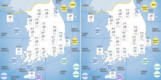 주요 지역의 기온은 ▲서울 5~10도 ▲인천 4~9도 ▲수원 4~11도 ▲춘천 2~8도 ▲강릉 5~7도 ▲청주 4~11도 ▲대전 5~12도 ▲전주 6~13도 ▲광주 8~13도 ▲제주 12~14도 ▲대구 7~10도 ▲부산 10~12도 ▲울산 10~12도 ▲울릉도·독도 6~8도 등이다.