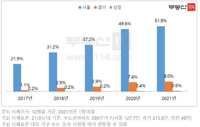 수도권 390만개 시세표본(1월 15일 기준) 중 9억 원 초과 고가 아파트는 총 83만6381가구로 이 중 서울이 79%(서울 66만3291가구)를 차지했다. 2017년 이후 4년 동안 서울시 주도로 수도권 고가 아파트가 54만 가구 늘어난 결과다. 서울에서 지역 내 재고 중 9억 원 초과 아파트가 가장 밀집된 곳은 서초구(95%)며, 이어 ▲강남(94%) ▲용산(90%) ▲송파(89%) ▲성동(85%) 순으로 조사됐다.