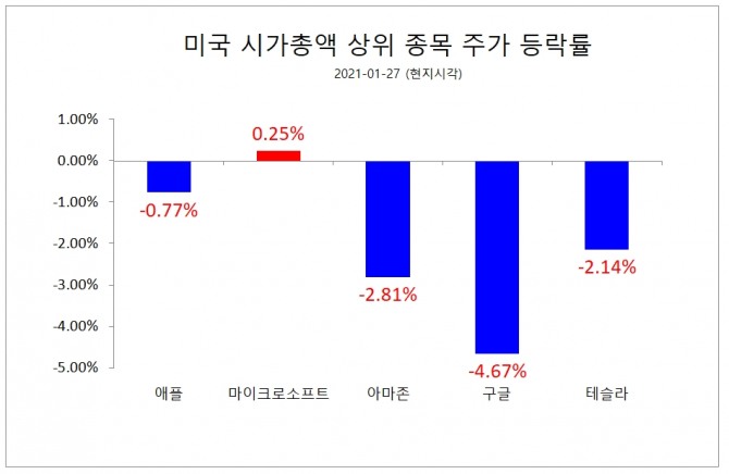 시가총액 상위 5대 종목에서 마이크로소프트만 상승했다.