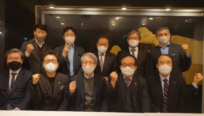 한국강소기업협회 임원들이 정운찬 명예회장(앞줄 왼쪽 세번째)과 함께 중견·중소기업의 발전을 다짐하는 결의를 다지고 있다. 사진=한국강소기업협회