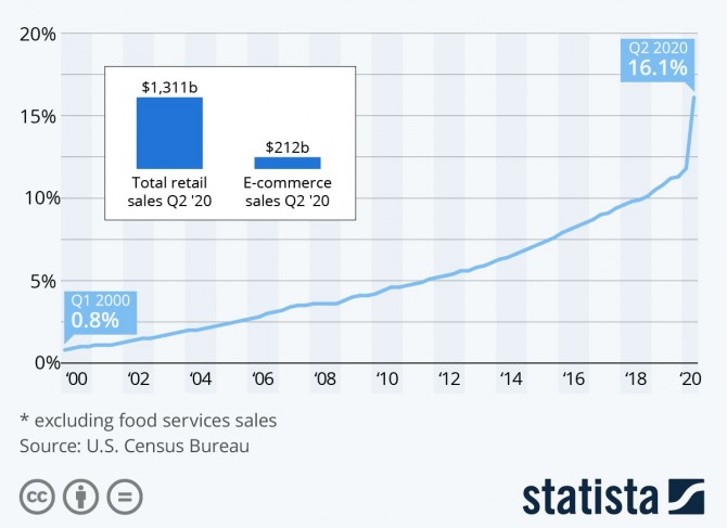 지금으로부터 약 20년 전인 2000년, 당시의 미국 소매업계에서는 ‘온라인 쇼핑’의 개념이 생소했다. 미국 통계청(U.S. Census Bureau) 자료를 분석한 Statista의 통계 데이터에 따르면, 소매업계 전체 매출에서 이커머스가 차지하는 비중이 1%에도 미치지 못하던 시대였다. 그로부터 10년 뒤인 2010년, 이커머스 매출 비중은 약 4%로 늘어났지만 전체 소매업계에서 이는 역시 미미한 수준이었으며 2018년에 이르러서야 약 10%를 기록하게 되었다. 2년 뒤인 2020년, 이커머스 매출 비중은 얼마나 성장했을까? 2020년 2분기를 기준으로 이커머스 매출은 전체 소매 매출에서 무려 16%를 차지하게 됐다.