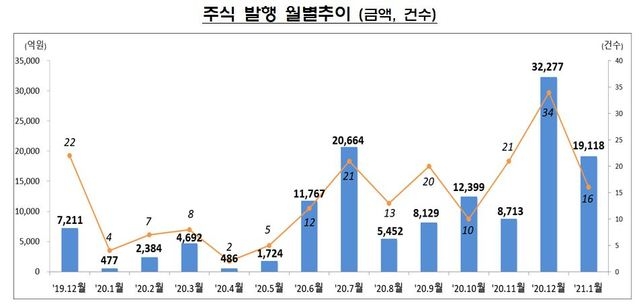 22일 금융감독원에 따르면 1월 기업들의 주식 발행실적은 16건, 1조9118억 원으로 전달의 34건, 3조2277억 원보다 40.8% 1조3159억 원 줄었다.