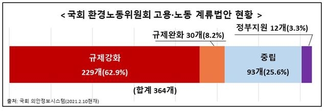 국회에 계류 중인 고용·노동법안 중 규제를 강화하는 법안이 완화하는 법안의 7.6배에 달하는 것으로 나타났다,