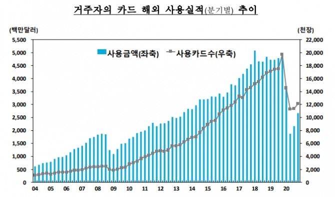 2020년 거주자의 카드 해외 사용실적이 급감했다.