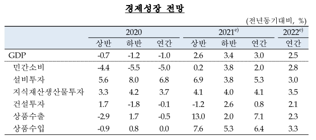 민간소비는 코로나19 확산세 심화, 가계소득 여건 부진 등으로 회복속도가 더딜 것으로 예상된다. 설비투자는 IT부문의 견조한 증가세가 이어지고 비IT부문도 완만하게 개선되면서 회복흐름을 지속할 전망이며 건설투자는 그간의 조정흐름이 마무리되고 점차 회복될 것으로 예상된다. 상품수출은 글로벌 경기개선, 반도체 수요 회복 등에 힘입어 양호한 흐름을 이어갈 전망이다.