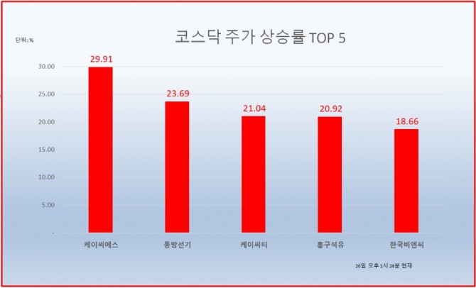 26일 1시 24분 현재 코스닥 상승률 상위 50개 종목은 다음과 같다.