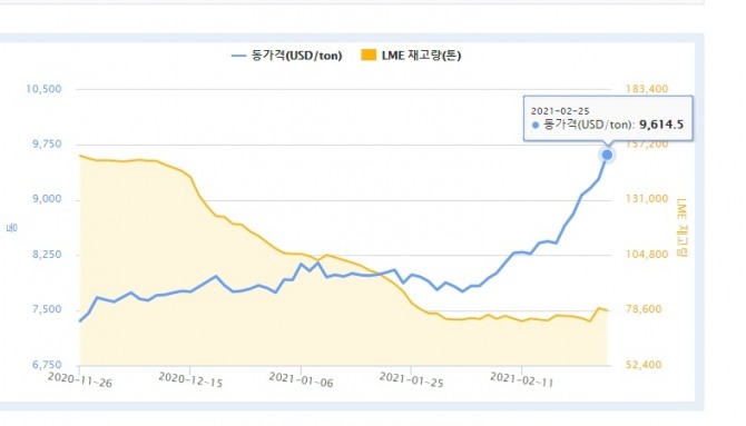 올들어 가파르게 상승중인 구리(전기동) 가격이 최고 1만2000달러에 이를 수 있다는 전망이 나왔다. 25일 런던금속거래소(LME) 가격이 t당 9614.5달러인 점을 감안하면 앞으로 약 25% 오를 가능성이 있다는 뜻이다. 1조 9000억 달러 규모인 미국의 경기부양책과 중국의 경제회복, 전기차 보급확대, 신종코로나바이러스감염증(코로나19) 사태에 따른 공급 부진 등 수급 여건상 가능한 수치로 보인다.