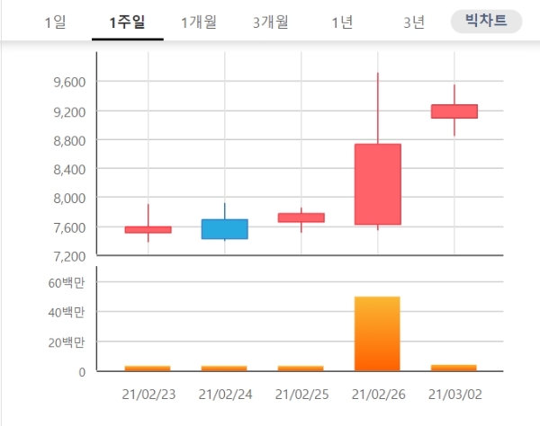 이미지 확대보기2일 한국거래소에 따르면 한국비엔씨 주가는 오전 9시 24분 현재 전거래일 대비 8.93% 오른 9510원 거래되고 있다.