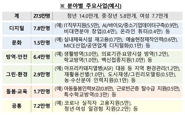 분야별로는 IT 직무지원 등 디지털 분야 7만8000개, 헬스장 재고용 지원 7000개, 생활방역 인력 3만 명, 학교 방역 인력 1만 명, 백신접종 지원 1만 명, 지역 환경관리 1만2000개, 아동 돌봄 인력 8000명 등 대부분 기존의 직접일자리와 유사하게 되어 있다.