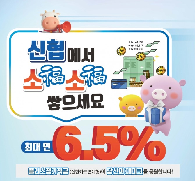 기본 금리는 연 2.0%로 신협 제휴 신한카드를 신규 발급받은 뒤 발급월 포함 3개월간 총 20만 원 이상 이용시 우대이율 4.0%포인트가 적용된다. 신협 입출금통장에 플러스정기적금 자동이체 등록 0.2%포인트, 적금 가입월부터 연속 3개월간 월 50만 원 이상 급여 이체 0.1%포인트, 신한카드 결제계좌로 등록 0.2%포인트 등 총 0.5%포인트 추가 금리를 받을 수 있다.