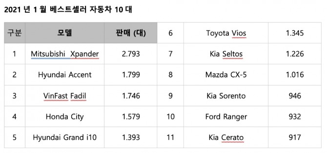 2일(현지시간) 베트남 자동차 제조협회(VAMA)가 발표한 2021년 1월 자동차 판매 순위에 따르면, 2793대가 팔린 미쓰비시 엑스팬더가 판매 1위를 차지했다. 2위는 1799대가 팔린 현대 액센트였다.