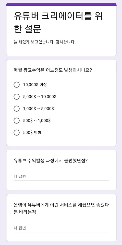 설문내용은 유튜브 광고 수익을 지급 받는 은행과 해당 은행을 선택한 이유, 광고 수익 규모, 은행에 바라는 서비스 등이다.