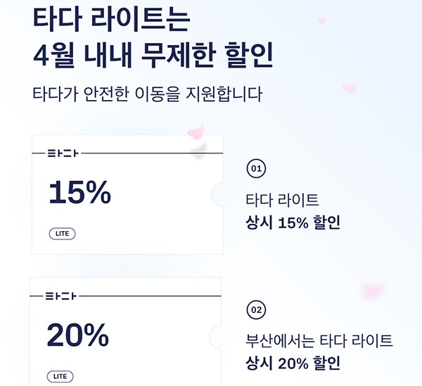 타다가 4월 한 달간 가맹택시 이용요금을 횟수와 한도 제한 없이 15~20% 할인해 준다.쏘카의 자회사 VCNC(대표 박재욱)는 코로나19 유행과 사회적 거리두기 장기화로 어려움을 겪는 가맹운수사, 드라이버와의 상생과 이용자의 안전한 이동을 지원하기 위해 가맹택시인 '타다 라이트' 요금을 서울, 성남 지역은 15%, 부산 지역은 20% 할인하는 캠페인을 벌인다고 31일 밝혔다.