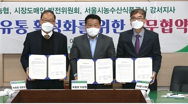 북파주농협 이갑영 조합장을 비롯한 시장도매인발전위원회 임완상 위원장, 서울시농수산식품공사 노계호 지사장이 협약서에 서명하고 협약서를 교환하며 3단체는 보다 긴밀한 협조관계로 발전을 다졌다.