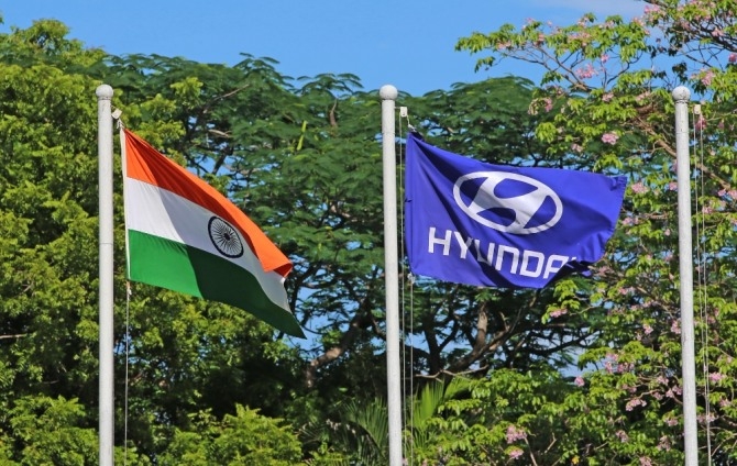 현대차 인도 첸나이 공장에 걸린 인도 국기와 현대차 사기(社旗). 사진=현대차