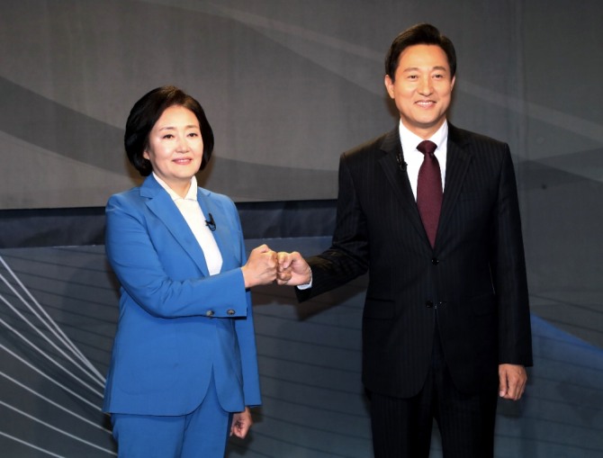 최종 결과는 개표가 마감되야 알겠지만, 테마주로 본 투자자들의 가상 대결은 오 후보의 우세를 예상했다.