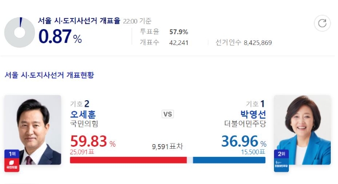 앞서 오 후보는 KBS·MBC·SBS 방송 3사 공동 출구조사에서 59.0%의 득표율을 기록해 37.7%에 그친 박 후보를 상대로 압승을 거둘 것으로 예측됐다. 다만 출구조사에는 지난 2~3일 진행된 사전투표는 반영되지 않았다.