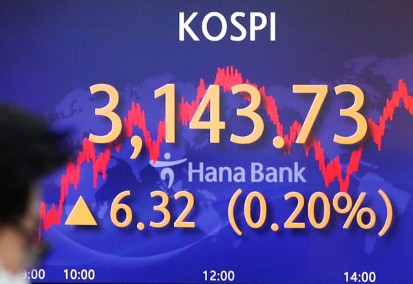 이미지 확대보기이날 한국거래소에 따르면 코스피는 전날 대비 0.19%(5.85포인트) 오른 3143.26에 거래를 마쳤다. 지수는 전장보다 0.11%(0.16포인트) 내린 3137.25로 시작해 하락하다가 장중 강세로 돌아섰다.