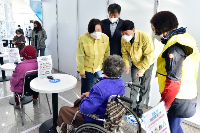 이미지 확대보기차준택 인천시 부평구청장은 8일 삼산월드체육관 코로나19 예방접종센터를 찾아 접종 대상자들의 불편사항을 현장에서 확인하고 진행상황을 점검했다.