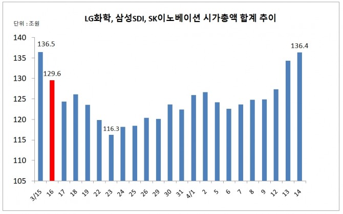 지난 13일 3사 시가총액 130조 원대를 돌파했고, 14일 장중 기준으로 폴크스바겐의 파워데이 '쇼크' 이전 수준까지 근접했다.