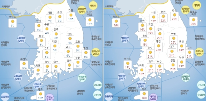 주요 지역의 기온은 ▲서울 7~19도 ▲인천 9~16도 ▲수원 4~19도 ▲춘천 3~22도 ▲강릉 10~25도 ▲청주 6~22도 ▲대전 5~22도 ▲전주 5~21도 ▲광주 5~21도 ▲제주 10~18도 ▲대구 6~24도 ▲부산 9~21도 ▲울산 9~21도 ▲울릉도·독도 11~20도 등이다.