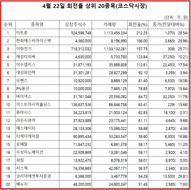 22일 주식시장에서 코스닥 종목의 거래량 회전율 기준 상위 종목은 다음과 같다.