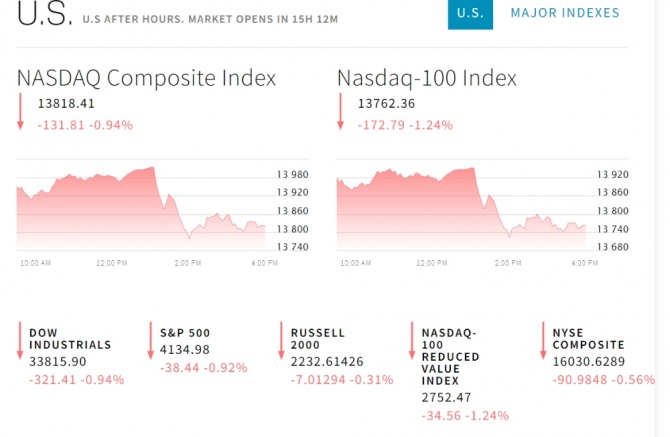 조 바이든 미국 행정부가 '부자 증세'를 곧 내놓을 것이라는 소식이 나오면서 뉴욕증시의 다우존스30 산업평균지수는 전장보다 321.41포인트(0.94%) 떨어진 33,815.90에 거래를 마쳤다. 스탠더드앤드푸어스(S&P) 500 지수는 38.44포인트(0.92%) 내린 4,134.98에, 또 기술주 위주의 나스닥 지수는 131.80포인트(0.94%) 내린 13,818.41에 장을 마감했다.