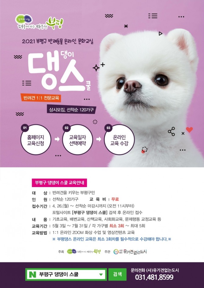 인천시 부평구(구청장 차준택)가 오는 26일부터 반려생활에 필요한 지식과 정보를 배울 수 있는 ‘부평구 온라인 문화교실 댕댕이 스쿨’ 참가자를 모집한다.