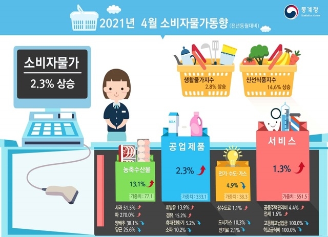 통계청이 4일 발표한 '4월 소비자물가동향'에 따르면 지난달 소비자물가지수는 107.39(2015=100)로 작년 같은 달보다 2.3% 올랐다.