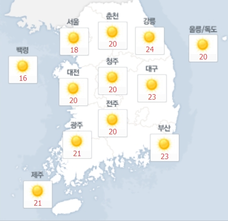낮 예상 최고기온은 서울 18도, 인천 16도, 수원 18도, 춘천 20도, 강릉 23도, 청주 20도, 대전 20도, 전주 20도, 광주 20도, 대구 23도, 부산 23도, 제주 21도다.