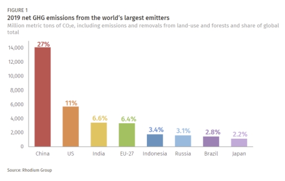 글로벌 컨설팅·리서치업체 로디엄그룹은 이날 발표한 연구보고서에서 지난 2019년 기준으로 전세계 온실가스 배출 실태를 조사한 결과 중국의 온실가스 배출량이 지구촌 전체에서 나오는 온실가스의 27%를 넘어섰다고 밝혔다.