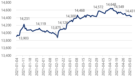 달러 대 루피아 환율 추이(2021.1.4.~2021.5.5.)