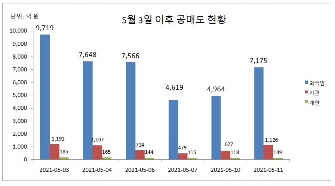 외국인, 기관 공매도 동반 '폭격'...개인투자자는 전날 보다 줄어