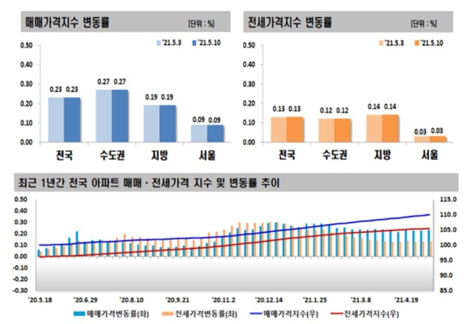 이미지 확대보기13일 한국부동산원이 발표한 5월 둘째 주(10일 기준) 주간 아파트 가격 동향에 따르면 수도권 아파트 매매가격은 0.27% 올라 지난주와 동일한 상승폭을 나타냈다.