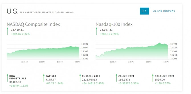 이날 뉴욕증시에서는 소매판매와 산업생산의 지표 부진이 효자가 됐다. 지표가 부진하게 나오면서 경기 과열에 대한 우려를 완화했다. 경제가 빠르게 회복되면서 물가 상승률이 가팔라질 수 있다는 우려로 최근 미국 주가지수는 크게 하락했으나 그 우려가 지나쳤음이 새삼 인식된 것이다. 인플레 공포에 따른 낙폭 과대 지적이 나오면서 반발 매수세와 경제 재개로 뉴욕증시기 다시 살아났다.