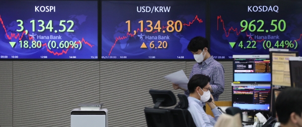 이날 한국거래소에 따르면 코스피는 전날에 비해 0.60%(18.79포인트) 내린 3134.53에 거래가 시작됐다.