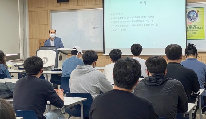 이미지 확대보기AI융합대학 공과대학 2~3학년과 지역사회 구성원들을 아우르기 위해 대면과 비대면을 병행해 실시된 이날 특강에서 임경렬 교수는 IBM AI 의사 왓슨과 메디컬 데이터기반 질환 예측 의료 내용을 담은 ‘인공지능과 의료융합’에 관해 강의 참석자들과 소통했다.