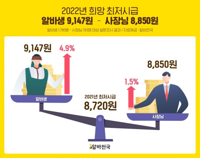 이미지 확대보기구인구직 아르바이트 전문 포털 ‘알바천국’이 알바생 1790명과 사장님 193명을 대상으로 2022년 희망 최저시급을 조사한 결과, 알바생은 평균 9147원, 사장님은 8850원을 원하는 것으로 집계됐다.