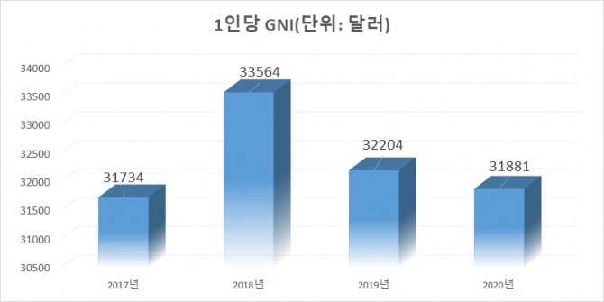 지난해 환율이 1% 넘게 오르면서 미 달러화 기준으로 전년보다 1.0% 줄었으나 원화 기준으로는 0.2% 늘었다. 한국은 2017년 3만1734달러로 국민소득 3만달러 시대를 열었고 2018년 3만3564달러로 증가했다. 그러나 2019년 3만2204달러, 2020년 3만1881달러로 2년 연속감소하고 있다.