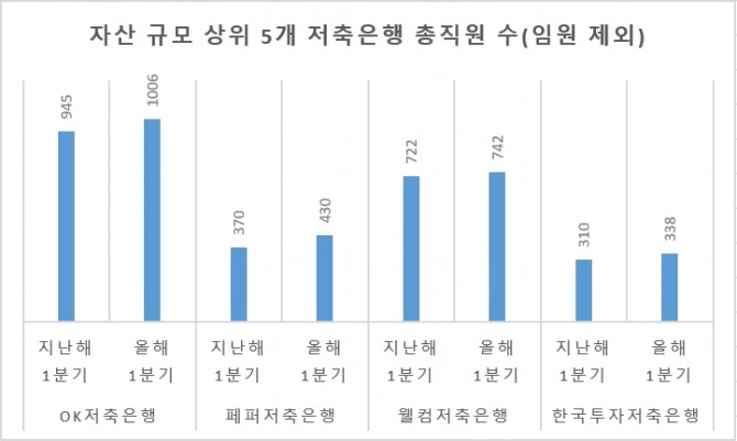 이미지 확대보기9일 저축은행 업계에 따르면 올해 1분기 기준 자산 규모 상위 5개 저축은행(SBI·OK·페퍼·웰컴·한국투자저축은행)의 총직원 수(임원 제외)는 3089명으로 집계됐다. 이는 지난해 같은 기간(2930명)보다 약 5.4% 늘어난 규모다.