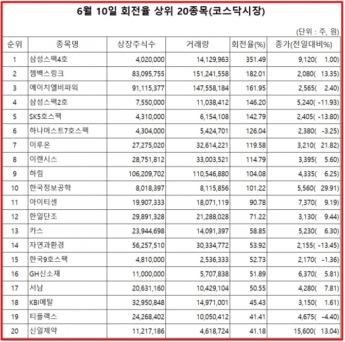 10일 주식시장에서 코스닥 종목의 거래량 회전율 기준 상위 종목은 다음과 같다.