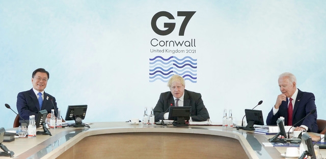 문 대통령은 이날 영국 콘월 카비스 베이 호텔에서 열린 G7 확대회의 1세션에 참석했다.