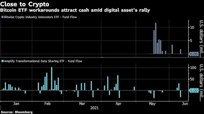 한편 코인 열풍 속에서 새로운 삶을 찾는 오래된 상품들이 줄줄이 생겨나고 있다. 마이크로스트래티지, 페이팔(PayPal Holdings) 등 주식을 보유한 적극적 운용 펀드인 Amplify Transformational Data Sharing ETF는 가격이 30%나 오르면서 올해 이미 7억1100만 달러 이상을 유치했다. 블록체인 기술을 이용하거나 개발하는 기업에 투자하는 First Trust Indxx Innovative Transaction & Process ETF (LEGR)라는 펀드는 역대 최고의 자금 유입을 앞두고 있다.