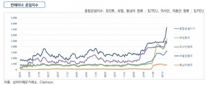 15일 업계에 따르면 컨테이너선 운임을 보여주는 종합 SCFI 지수는 지난해 상반기 평균 1000 포인트 수준에서 지난해 하반기 3000 포인트로 급증했다.