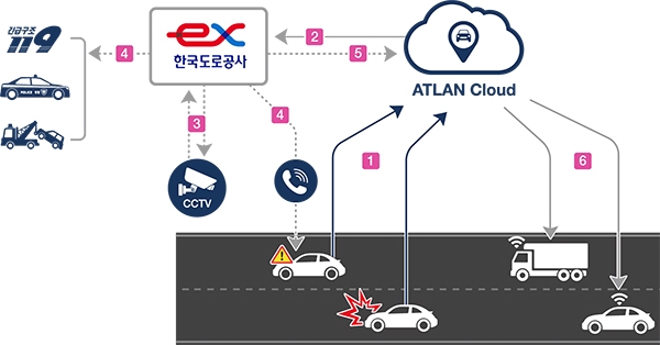 도로공사가 CCTV를 통해 확인한 돌발상황 정보를 맵퍼스에 전송하면 사고지점으로 향하는 3km 내 후방의 아틀란 사용자들에게 안내된다.