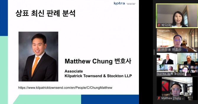 KOTRA 뉴욕 무역관 IP-DESK는 ‘지식재산권 주요 판례 분석’에 관한 웨비나를 5월 27일 주최했다. 킬패트릭 타운센드 엔 스토큰(Kilpatrick Townsend & Stocken LLP)의 매튜 정(Matthew Chung) 변호사가 상표 판례 최신 분석에 대해 연사로 나섰다. 특허 관련 최신 판례에 대해서는 모르간 르위스 복키어스(Morgan, Lewis & Bockius)의 구태웅 변호사가 연사로 나서 법원의 최근 판결에 관해 설명했다. 마지막으로 에이엔이 네트웍스(A+E Networks)의 지나 김(Zena Kim) 변호사가 저작권 판례 분석에 대한 최신 현황에 대해서 소개했다.
